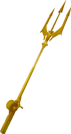 The Trident Rod is a Rod in Fisch featuring a golden-coloured three-pronged design resembling a traditional trident. The rod's shaft radiates a glowing yellow aura, emphasising the sheer power it holds.